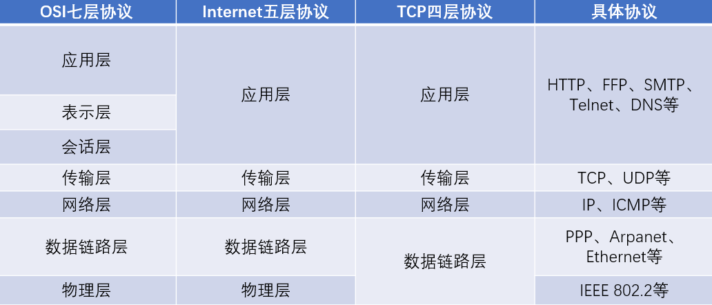 网络协议根据网络层次分类,后面再讨论具体层次协议,这里主要是区分几个层次划分,分别是OSI七层协议、Internet五层协议、还有后面TCP用到的TCP四层协议;